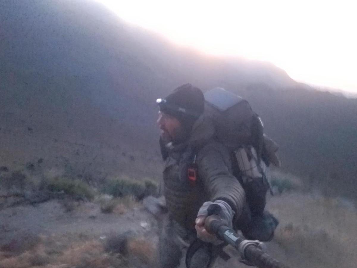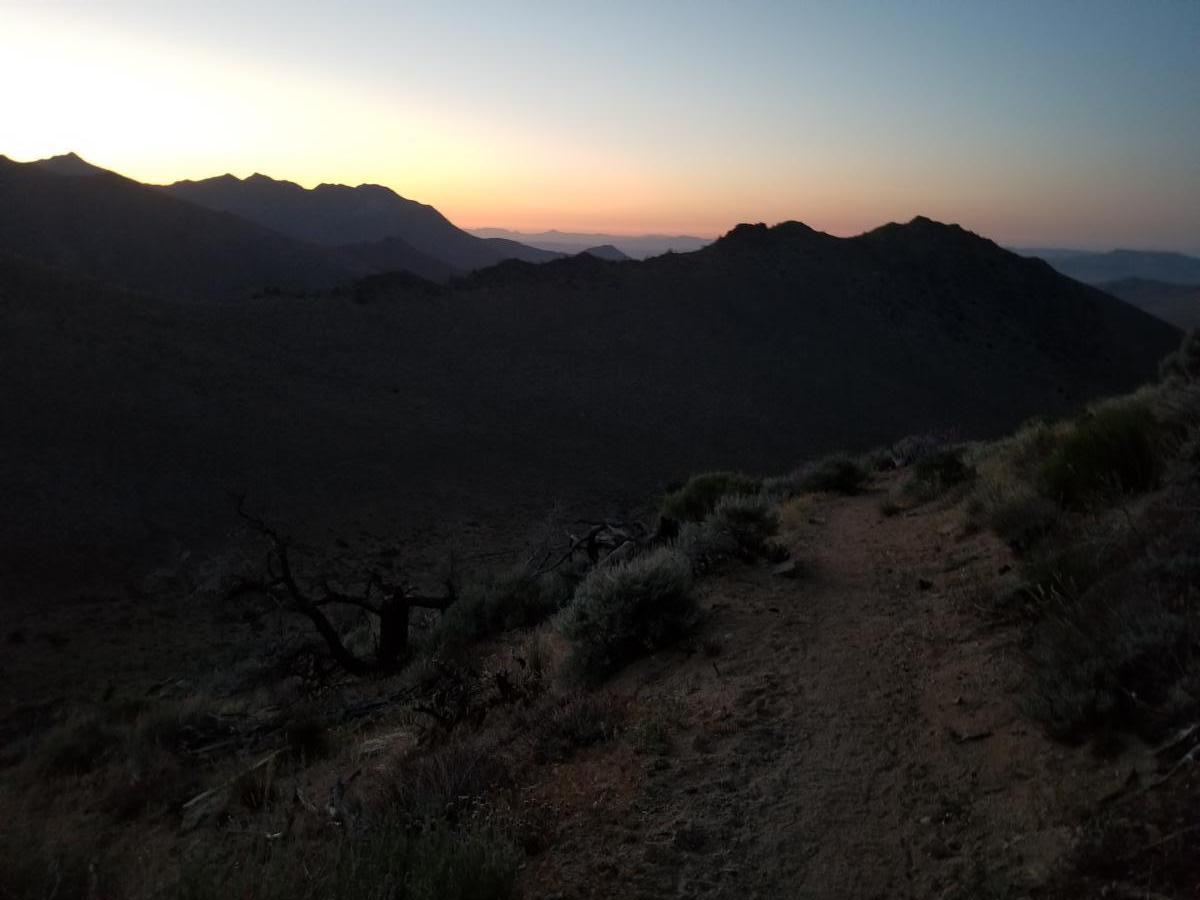 Meanwhile, my idea to night hike last night while different and interesting, it propbably didn’t help me much when it comes to making miles quickly. I made it to the top of the first ridge before the sun peaked over the mountains to the east, so I took some time to make breakfast. It was another cold breezy morning, so waiting for some solar gain seemed prudent. The next trail segment was on the western slope of the ridge, so it’s going to be cool for a while. Due to my lack of sleep and early start, I’m not energetic at all and walking slow and taking many breaks. This allows Rockin’ and Safety to catch me soon enough, and then they leave me. Since today’s distance isn’t very long (water sources, remember?) I’m not in much of a hurry, anyway.